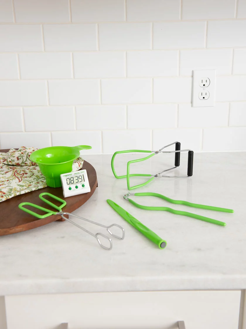 All the essential tools to get you canning like a pro! Funnel, jar lifter, combination bubble remover and magnetic lid lifter, jar wrench, tongs, plus digital timer. All-metal tools have heat-resistant plastic grips for safety and comfort.