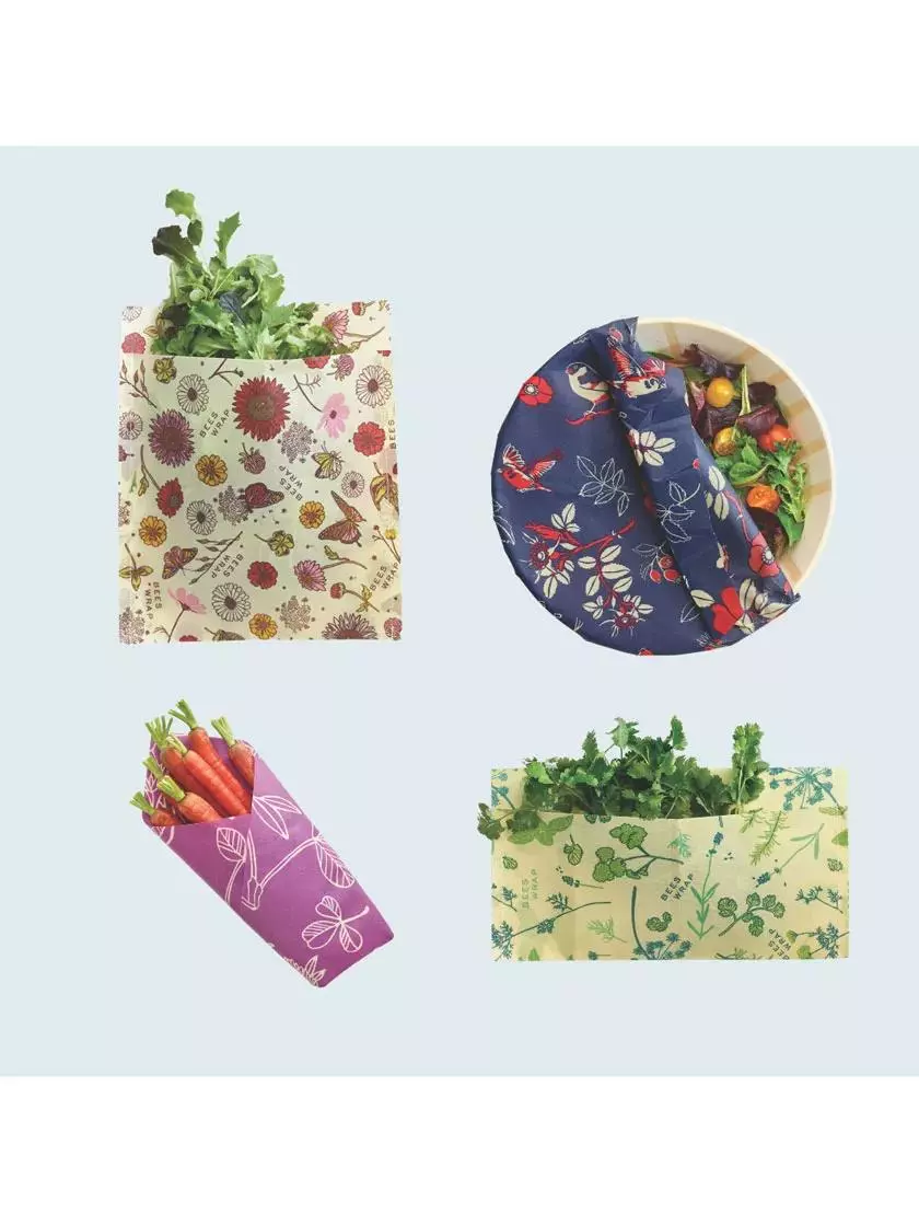 When plastic wrap and sealable food storage bags were first released, most people thought they were the bee’s knees. But now that we understand the long-term environmental harm that single-use plastics create, we’re glad to find an earth-friendly alternative from Bee’s Wrap! This super-reusable food storage starter pack from Bee’s Wrap, has everything a gardener needs to preserve the fruits (and vegetables) of their labor — without any plastic: Herb Bag (13″ x 5.75″): Save a bunch of cilantro, a bouquet of basil, or sprigs of rosemary. Produce Bag (11″ x 11″): Store a head of lettuce, a handful of citrus, or a bunch of grapes. Medium Wrap (11″ x 10″): Store cheese, bundle baked goods, pack snacks to-go. HexHugger™ Large Bowl Cover (14.5″ x 14.5″): Sized to fit an extra-large salad bowl. Made in the USA with organic cotton, beeswax, organic plant oil, and tree resin, Bee’s Wrap products feature fun, vibrant prints. Use the warmth of your hands to shape Bee’s Wrap around food, creating a protective, breathable seal. Reuse for an entire year with regular use and good care. To clean, use cool water and mild soap, then air dry. Avoid exposure to heat and hot water to keep your Bee’s Wrap in tip-top shape. Do not use with raw meat. When Bee’s Wrap loses its sticky grip, it can be composted or used as a natural fire starter.