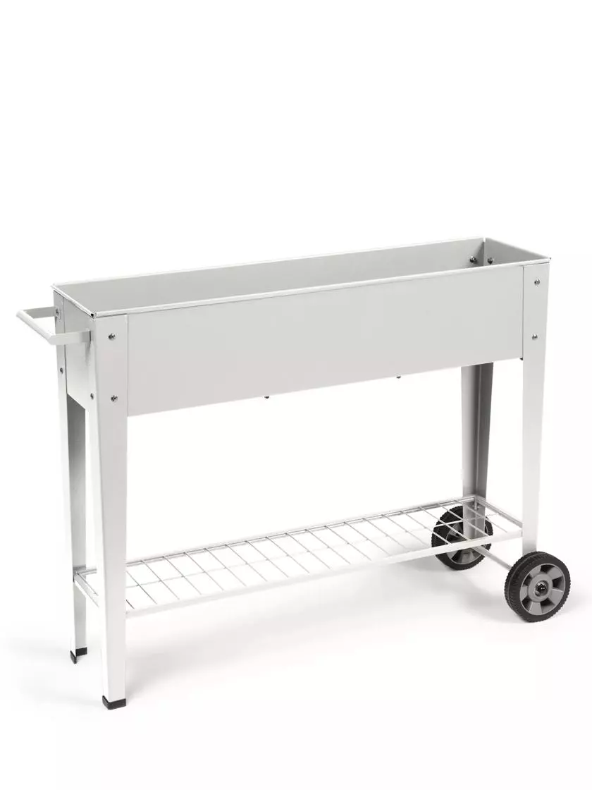 Planted with flowers, vegetables or herbs, this mobile cart is a beautiful addition to your porch, patio or balcony. The planter box sits at a comfortable working height, making it easy to tend. And your plants are out of reach of animal pests, too. With large, 5-3/4″ diameter wheels and a sturdy handle, you can easily roll it on your deck or patio to keep plants in the sun or to move it out of the way. The cart is made from sturdy yet lightweight, powder-coated steel in rich hues to complement your landscape and showcase plants. A handy shelf holds accessories.
