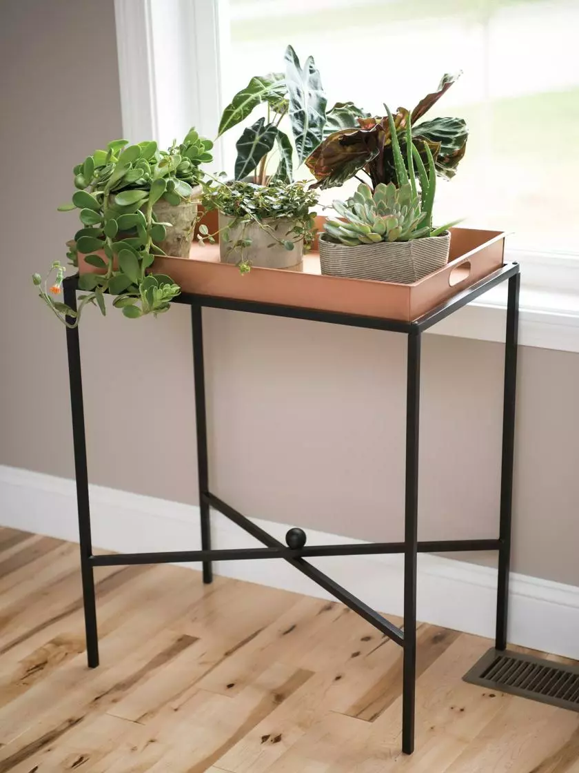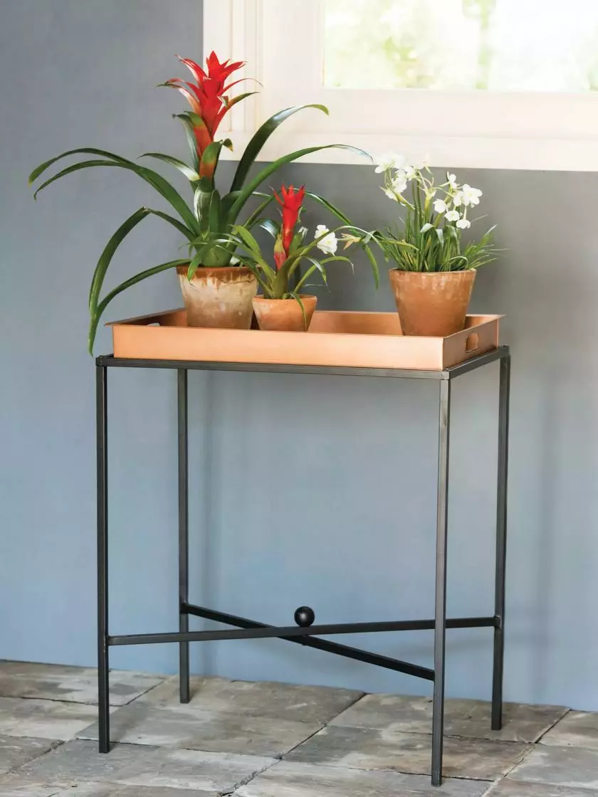 The newest addition to our Vermont-designed Essex collection of stands and supports, this update of an old classic is beautifully executed. Watertight tray catches spills — be they from hastily giving your plants a drink, or missing the teacup as you pour from the pot. Tray also lifts off, so you can easily move the stand from room to room or from house to porch. (Great for serving tea on the lawn too.) Note: tray does not have a drainage hole, so when using this butler’s tray as a plant stand, keep it in a protected area where it won’t get waterlogged.