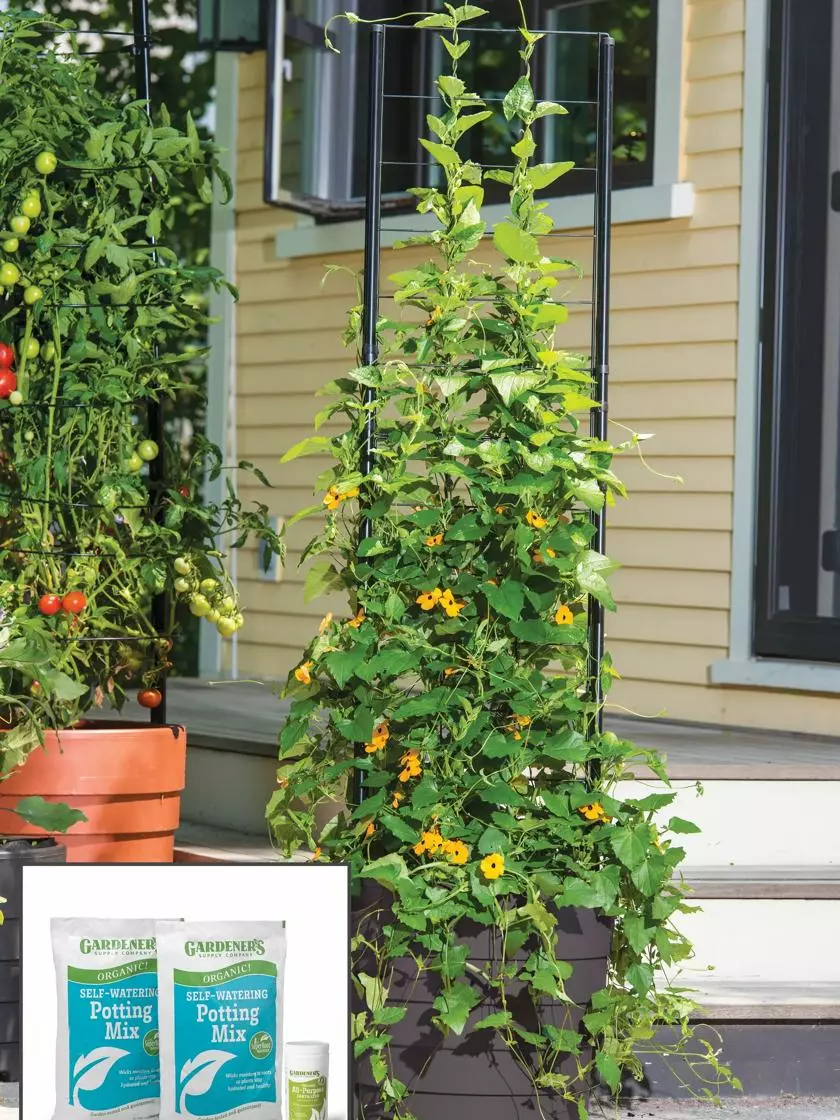 Want to grow a vining flower or veggie but don’t have the garden space? Consider this innovative container garden. Developed specifically for beans, peas, cucumbers, clematis and other climbers, it all starts with the Gardener’s Victory Self-Watering Planter: a large-capacity container with a three-part self-watering system, optimal airflow, and integrated support structure.