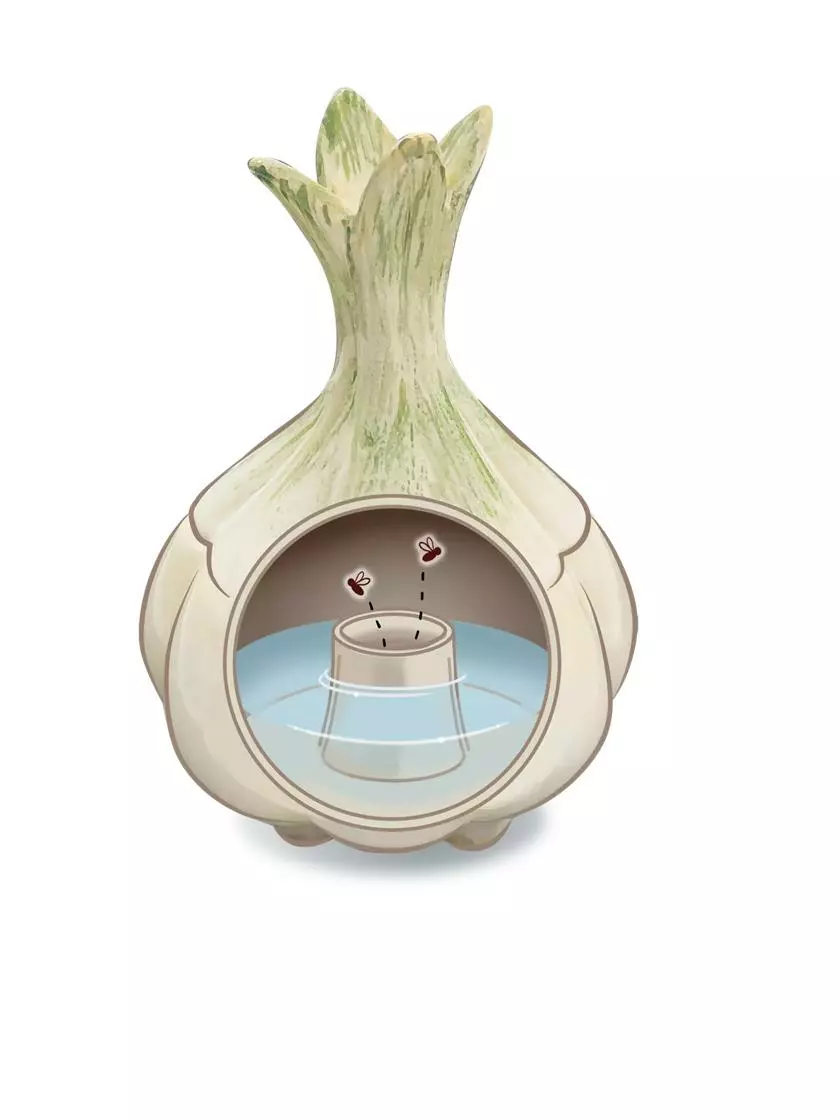 This disarming garlic bulb has a dual purpose as a fruit fly trap. Set it on your counter and enjoy a pest-free kitchen for up to 30 days! Flies are attracted to your homemade lure solution inside, but can’t make their way back out. Swishing the liquid around every few days will help redirect any remaining flies’ attention to it.