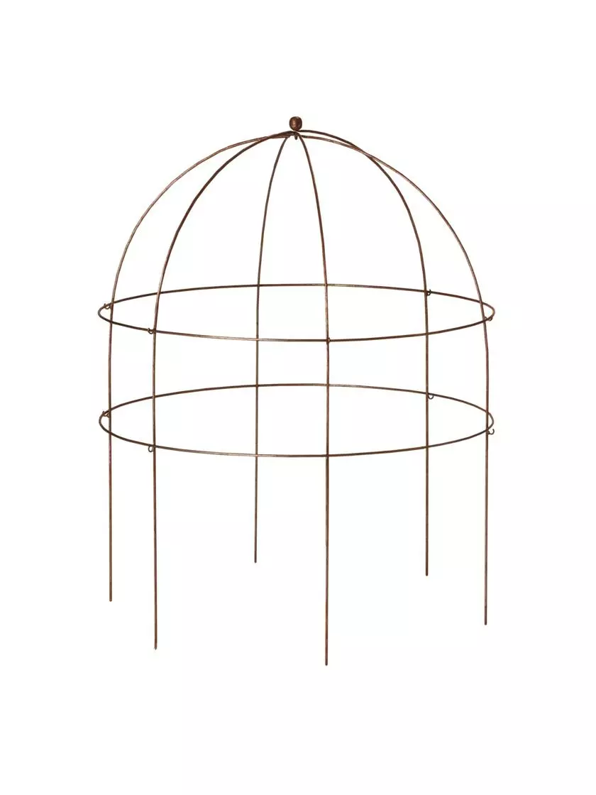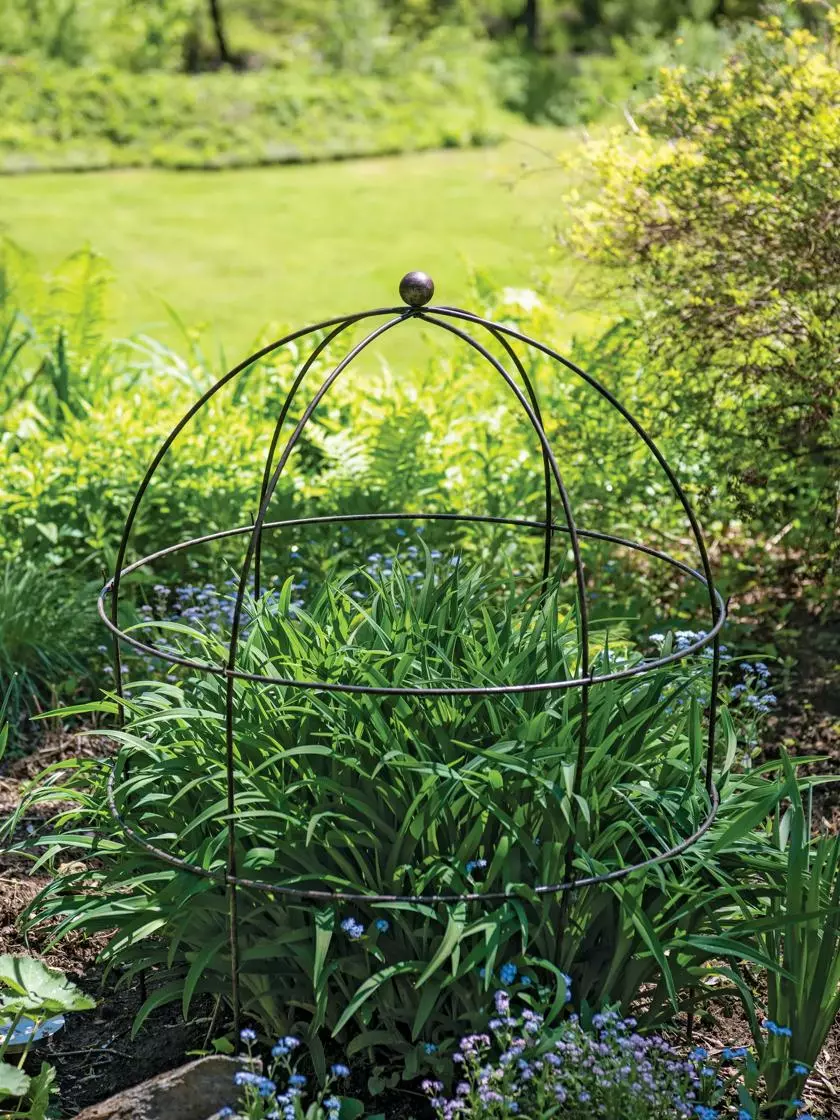 This extra-sturdy grow-through support keeps plants contained and upright. Perfect for large peonies, baptisia and similar vigorous plants. Or place the support around a special plant you’d like to highlight. This unusual and eye-catching support is a piece of landscape art even when plants aren’t grown in. Adorn it with fairy lights and greens for a striking addition to your holiday decorations. The powder-coated steel has been painted by hand to resemble weathered, rusted metal. New easy assembly.