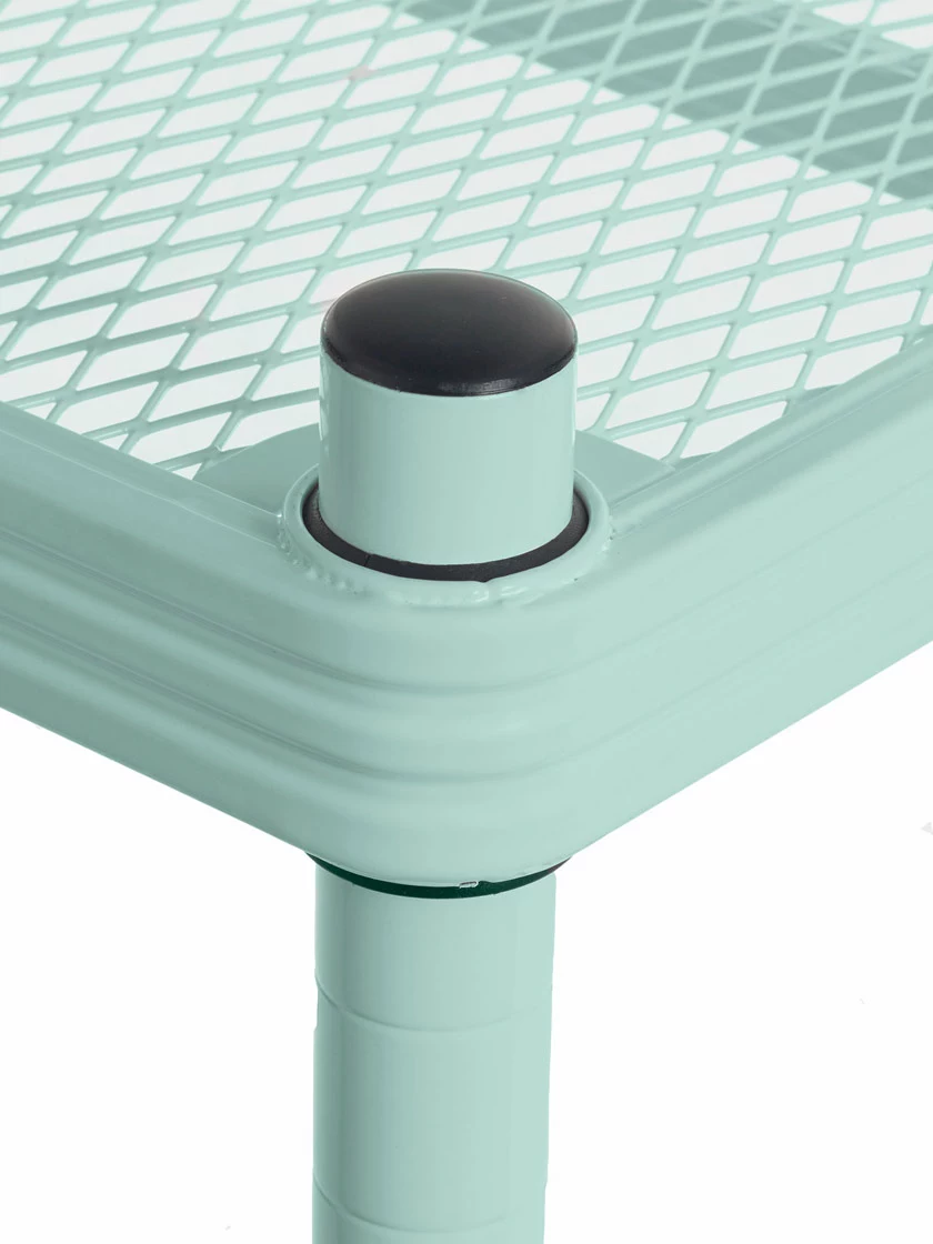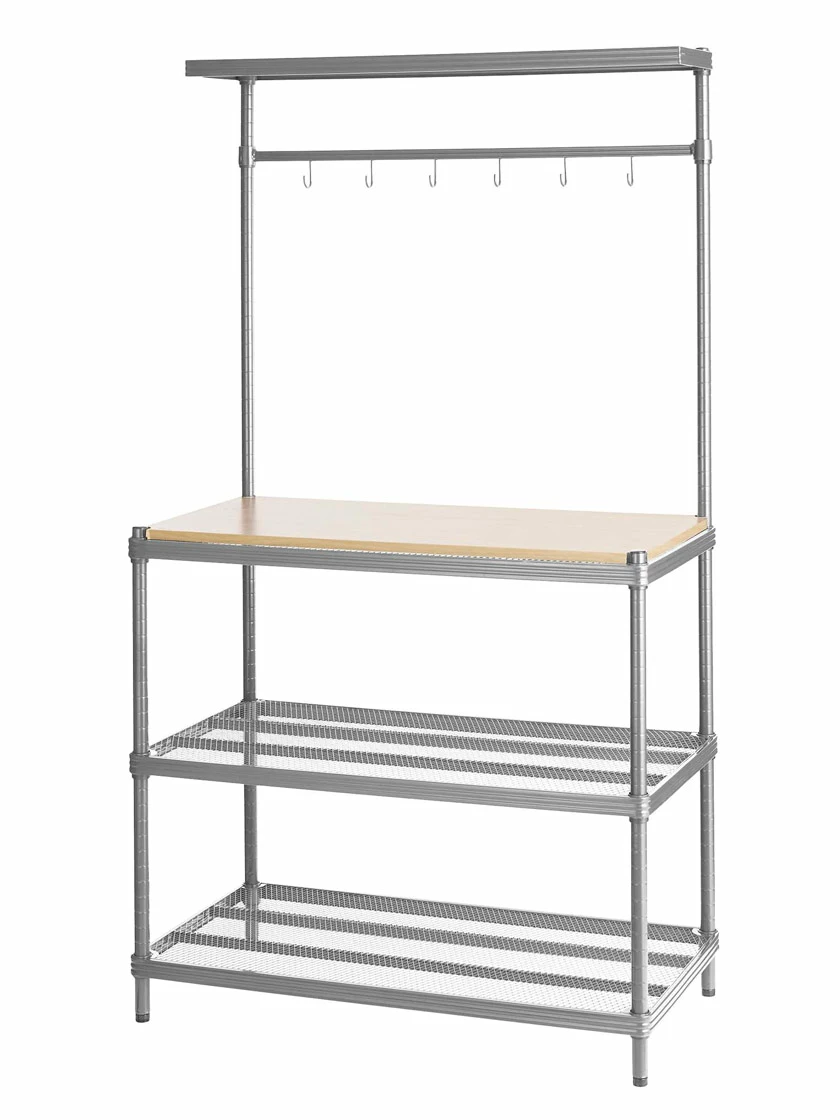 Traditional wire shelves can cause a headache as items can fall through the wide gaps on the shelves. Our brilliantly engineered mesh shelving units use a larger gauge of expanded metal mesh for style, strength and functionality. Each shelf has a weight limit of 440 pounds to safely hold everything from small knick knacks to large, heavy bins. The utility unit includes 4 adjustable shelves, a hook rack with 6 hooks, and a removable wood top work surface. Use in your prep area, the garage or garden shed to organize tools and potting supplies.