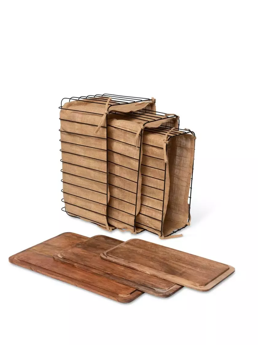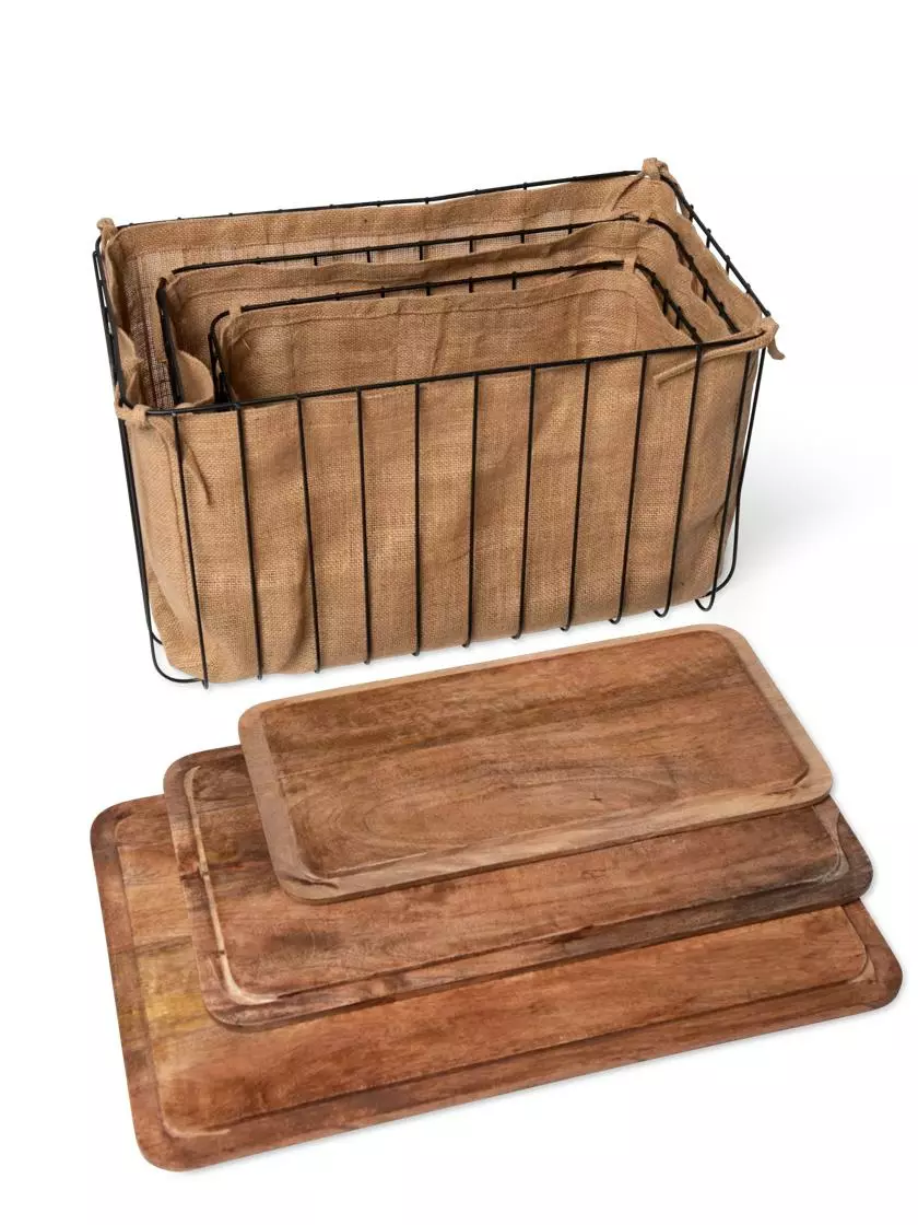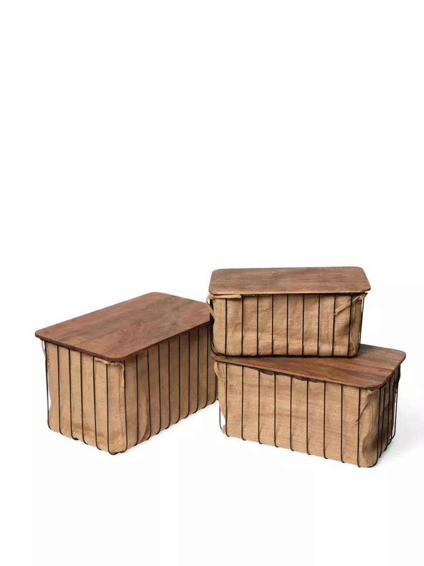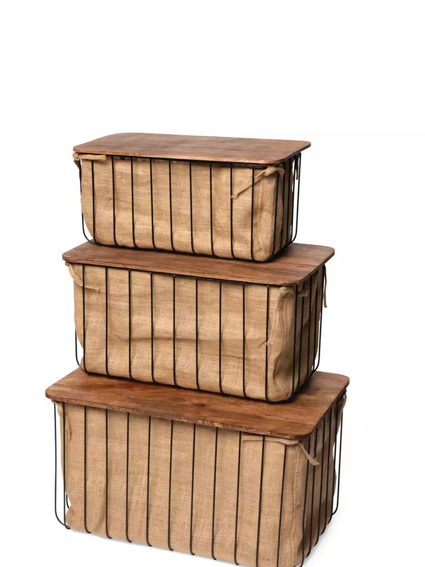 Root vegetables keep longer when they’re stored in the dark and have good air circulation. These wire bins have natural, air-permeable jute liners that block light. Sturdy mango wood lids are not only attractive but provide a solid surface for stacking. They nest for even more compact storage too!