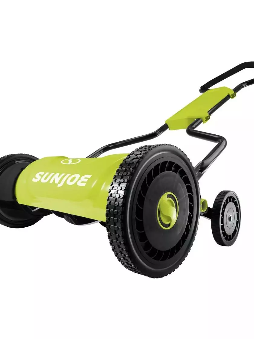 Get down-to-earth with this Manual Reel Mower from Sun Joe. Powered with just a push, the MJ1800M is the ultimate classic reel mower with a sleek, modern design. Sun Joe has taken your grandfather’s old-fashioned reel mower and brought it into the 21st century. With the rotating, 5-blade RAZOREEL system, the completely eco-friendly MJ1800M cuts a crisp 18-inch path in a single pass — no oil, gas, or electricity required. Equipped with all-terrain, quad-wheel design, the no-frills, people-powered push mower is easy-to-use, lightweight and maneuverable, all while providing a quiet, eco-friendly solution for any lawn. With 5-position adjustable height control — from 1.1 to 3.2 inches — you’ll have the ultimate control to select just the right height so your yard will always look its best. Put power and precision at your fingertips, take back your yard and Go With Joe®.