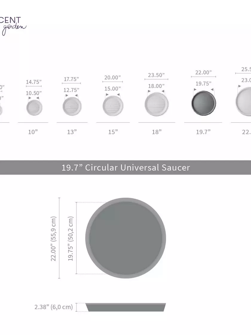 - 19-3/4″ saucer (interior diameter) is 22″ overall x 2-1/4″ H