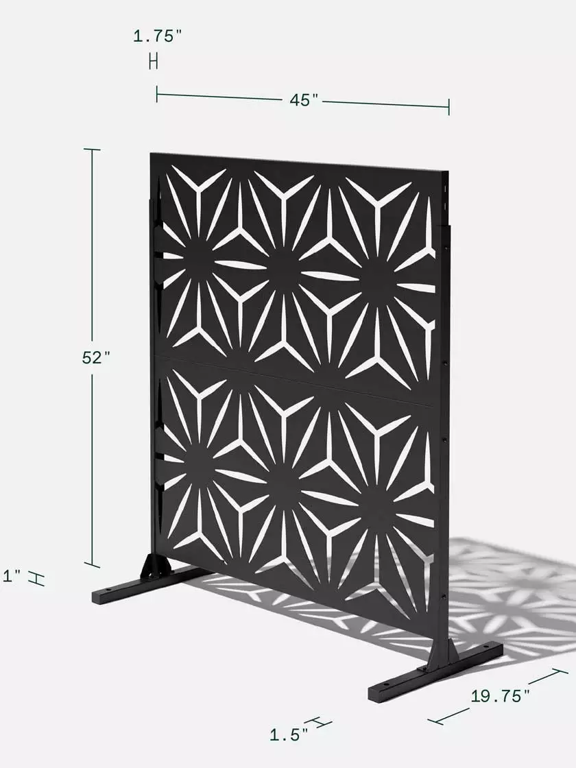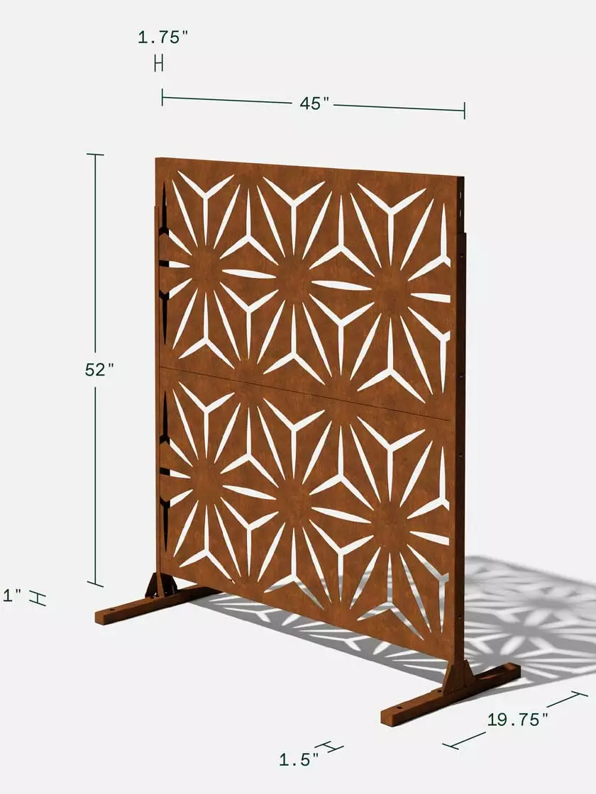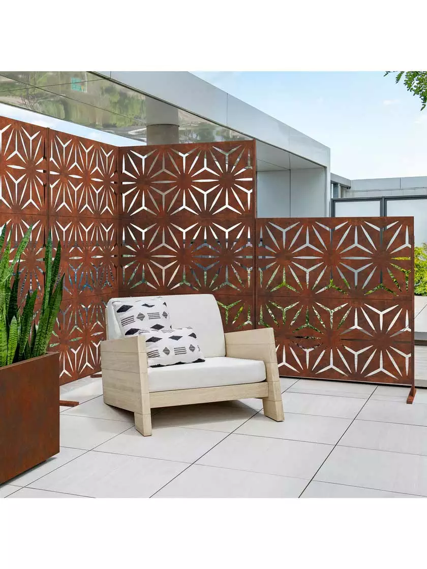 Privacy has never looked so good! Transform your backyard or deck with an outdoor two-panel privacy screen set. The star design of this panel provides 85% privacy. Use it to hide an unsightly view, to block unwanted direct sunlight, create privacy or to frame an outdoor room. This screen is made from 1-1/2 mm laser cut steel designed to resist corrosion through all seasons. Solid, yet lightweight, the black galvanized steel screen is protected by a strong, scratch-resistant powder coating that is treated with UV inhibitors to minimize fading. The Corten steel screens are shipped in their raw steel state, gradually developing a rich rust patina finish over time.