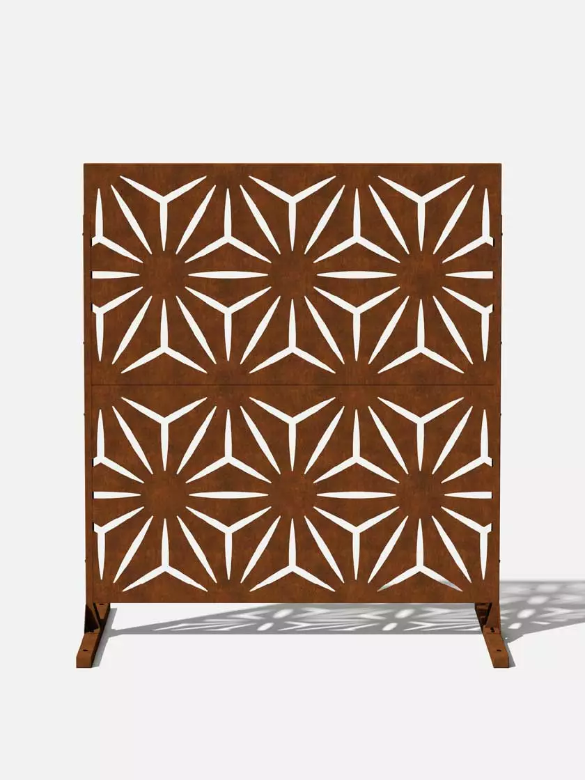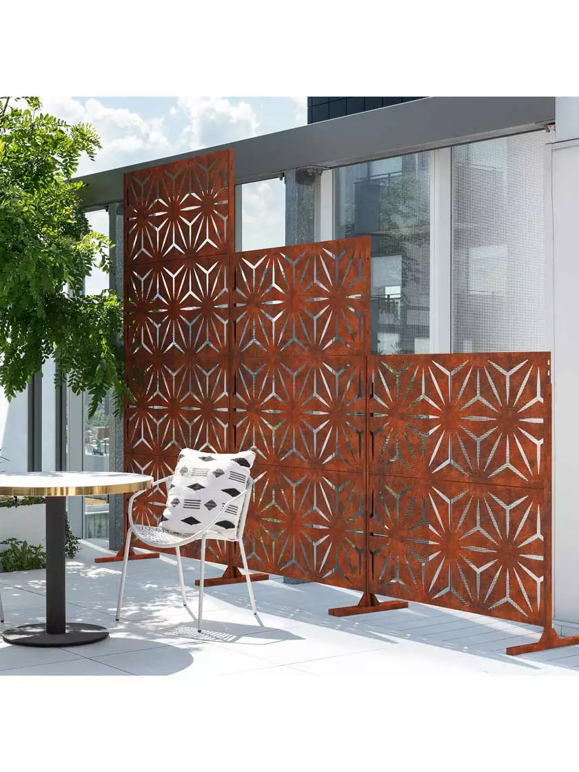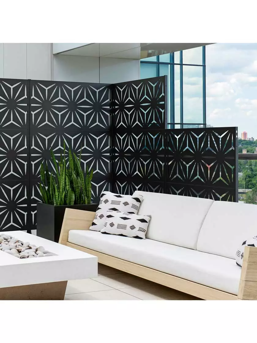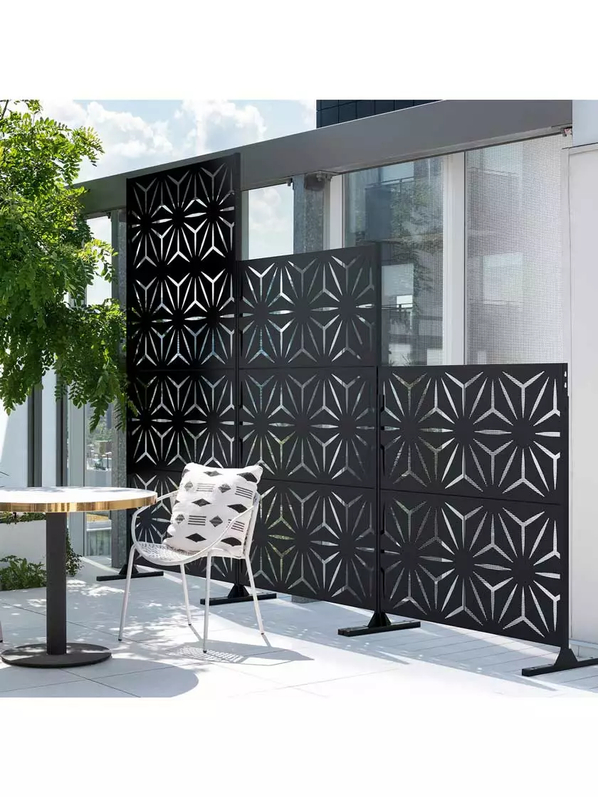 Privacy has never looked so good! Transform your backyard or deck with an outdoor two-panel privacy screen set. The star design of this panel provides 85% privacy. Use it to hide an unsightly view, to block unwanted direct sunlight, create privacy or to frame an outdoor room. This screen is made from 1-1/2 mm laser cut steel designed to resist corrosion through all seasons. Solid, yet lightweight, the black galvanized steel screen is protected by a strong, scratch-resistant powder coating that is treated with UV inhibitors to minimize fading. The Corten steel screens are shipped in their raw steel state, gradually developing a rich rust patina finish over time.