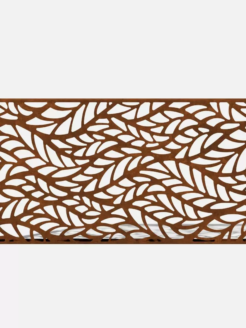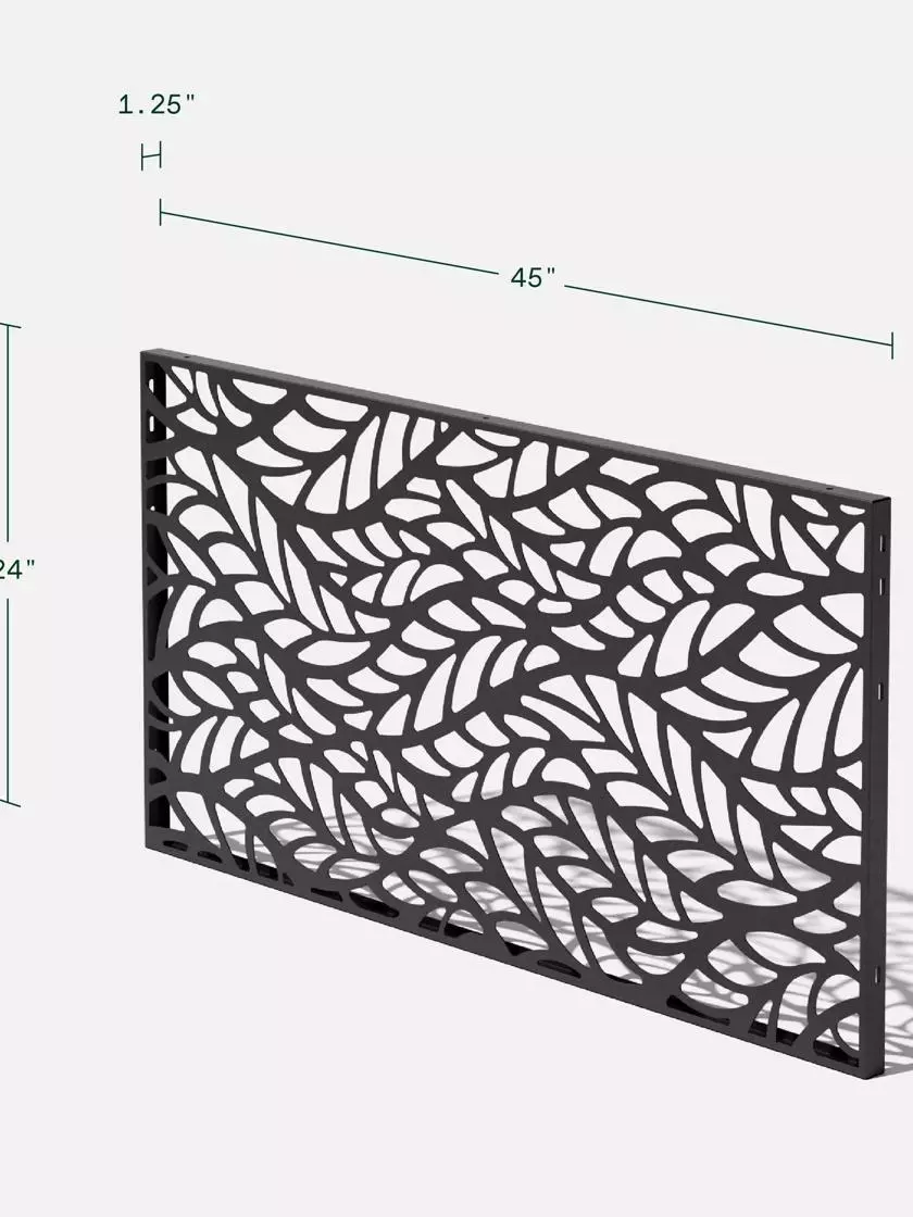 This screen is made from 1.5 mm laser cut steel designed to resist corrosion through all seasons. Solid, yet lightweight, the black galvanized steel screen is protected by a strong, scratch-resistant powder coating that is treated with UV inhibitors to minimize fading. The Corten steel screens are shipped in their raw steel state, gradually developing an attractive and protective patina of rust that safegaurds the base metal from corrosion.